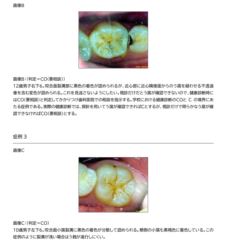 教育の場で行われる健康診断は、健康の保持増進を目的とした健康状態の把握であって、地域の医療機関における個人を対象とした健康診断や疾病の診断とは趣が異なっている。つまり、学校における健康診断は詳細な臨床検査などから確定診断を行うのでなく、「異常なし」、「定期的観察が必要」、「専門医(歯科医師)による診断が必要」にスクリーニング(ふるい分け)することを目的としている。また、取り上げるべき健康上の問題も、出現頻度の高いものだけでなく、たとえ出現頻度は低くとも、早期に発見し処置することが児童生徒等の生涯の健康にとって有益なものであれば、積極的に取り上げる事も必要です。