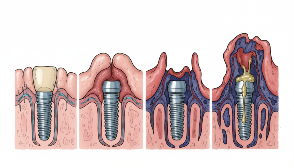 天然歯における歯周病と同様に、インプラント周囲の組織に炎症が起こる状態を指します。初期段階では歯肉の腫れや出血といった症状が現れ、これを「インプラント周囲粘膜炎」と呼びます。
