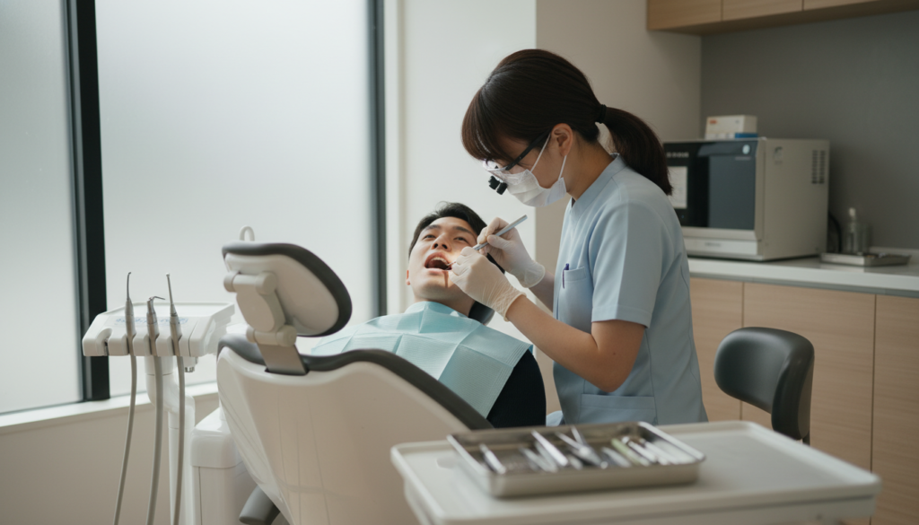 セルフケアだけでは除去しきれないプラークや歯石を、歯科医院での定期的なクリーニングで取り除きます。当院では、患者様の状態に応じて3ヶ月から6ヶ月ごとの定期メンテナンスを推奨しています。